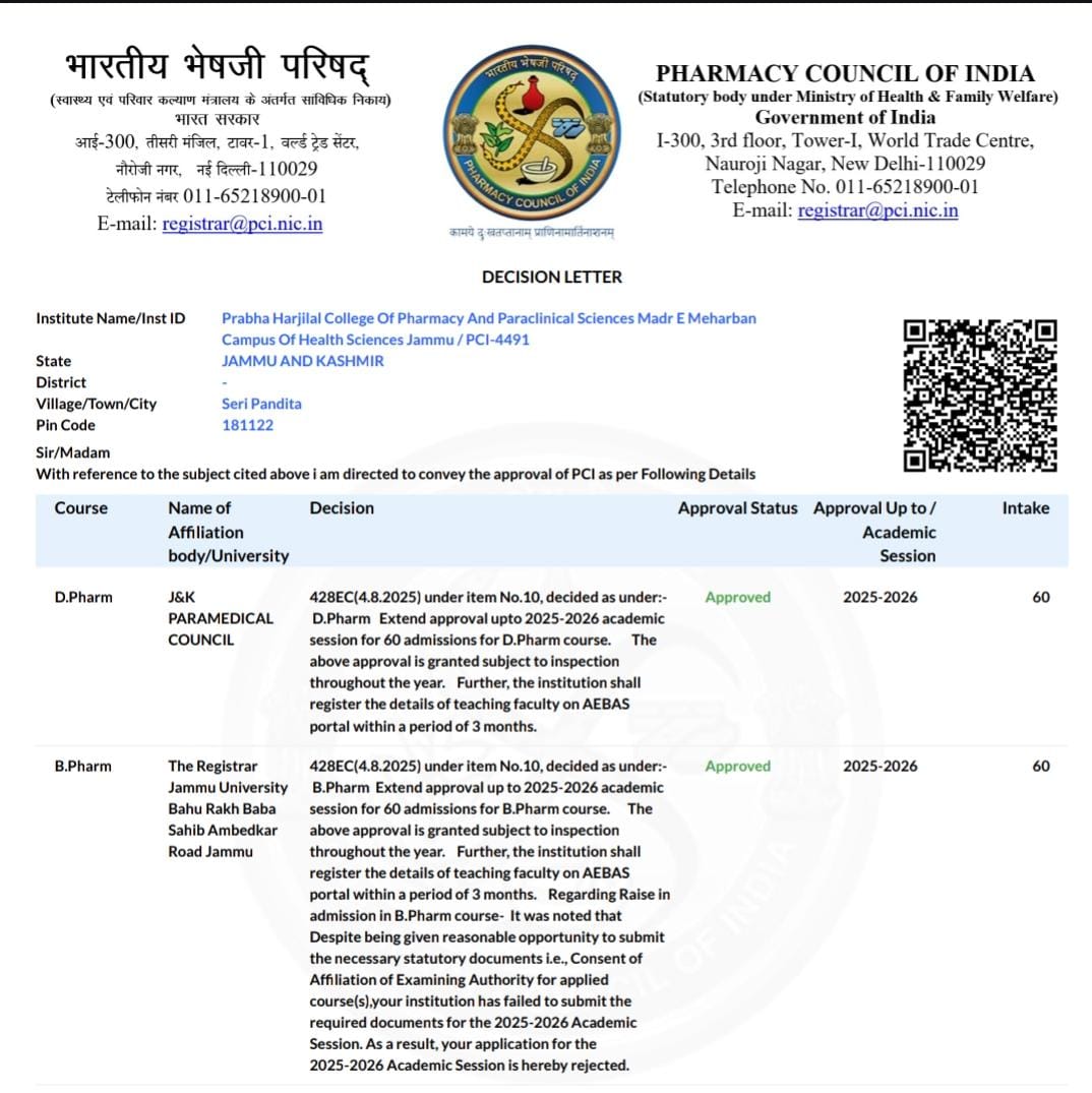 Prabha Harjilal College of Pharmacy & Paraclinical Sciences is a self financing educational institution that has been set up in the State of Jammu & Kashmir at the Madr-e-Meharban Campus of Health Sciences at Chak Bhalwal, on Jammu-Akhnoor Road at Jammu. The institution happens to be the first College of pharmaceutical sciences in the State. With the establishment of center for pharmaceutical sciences education in the State, a long felt deficiency in higher education in the region has been addressed to.