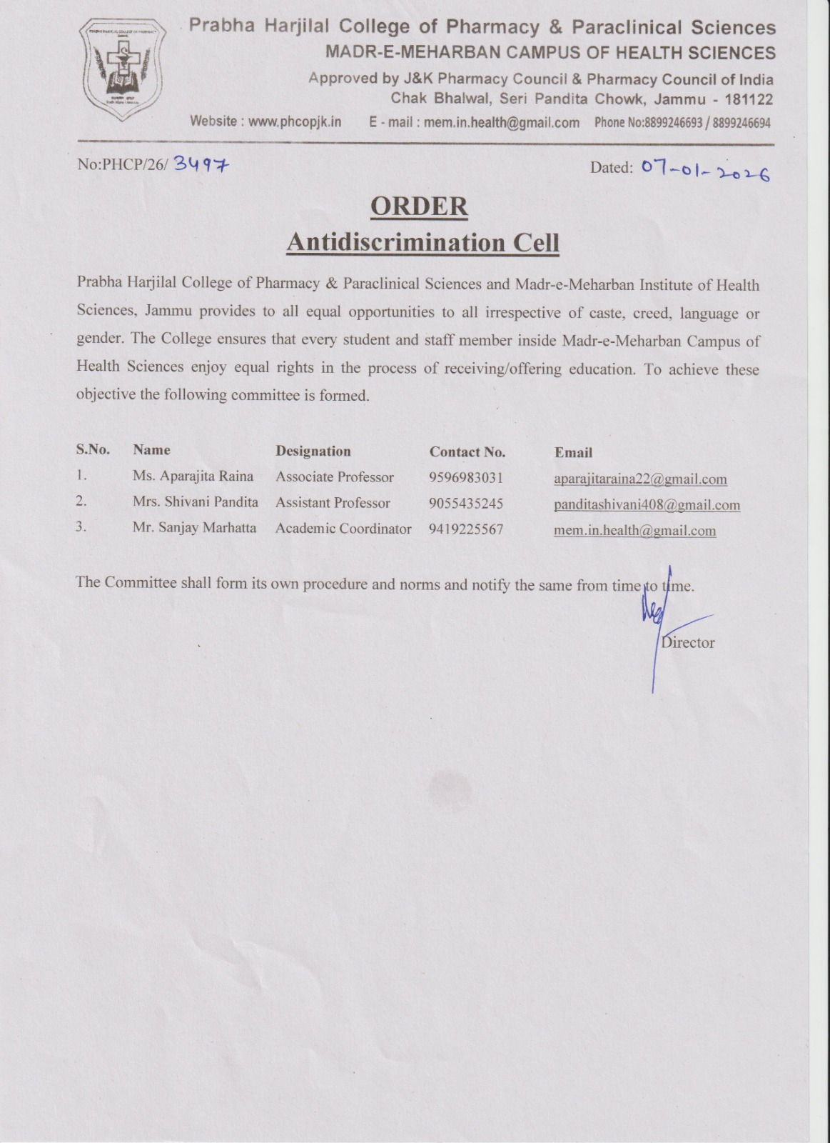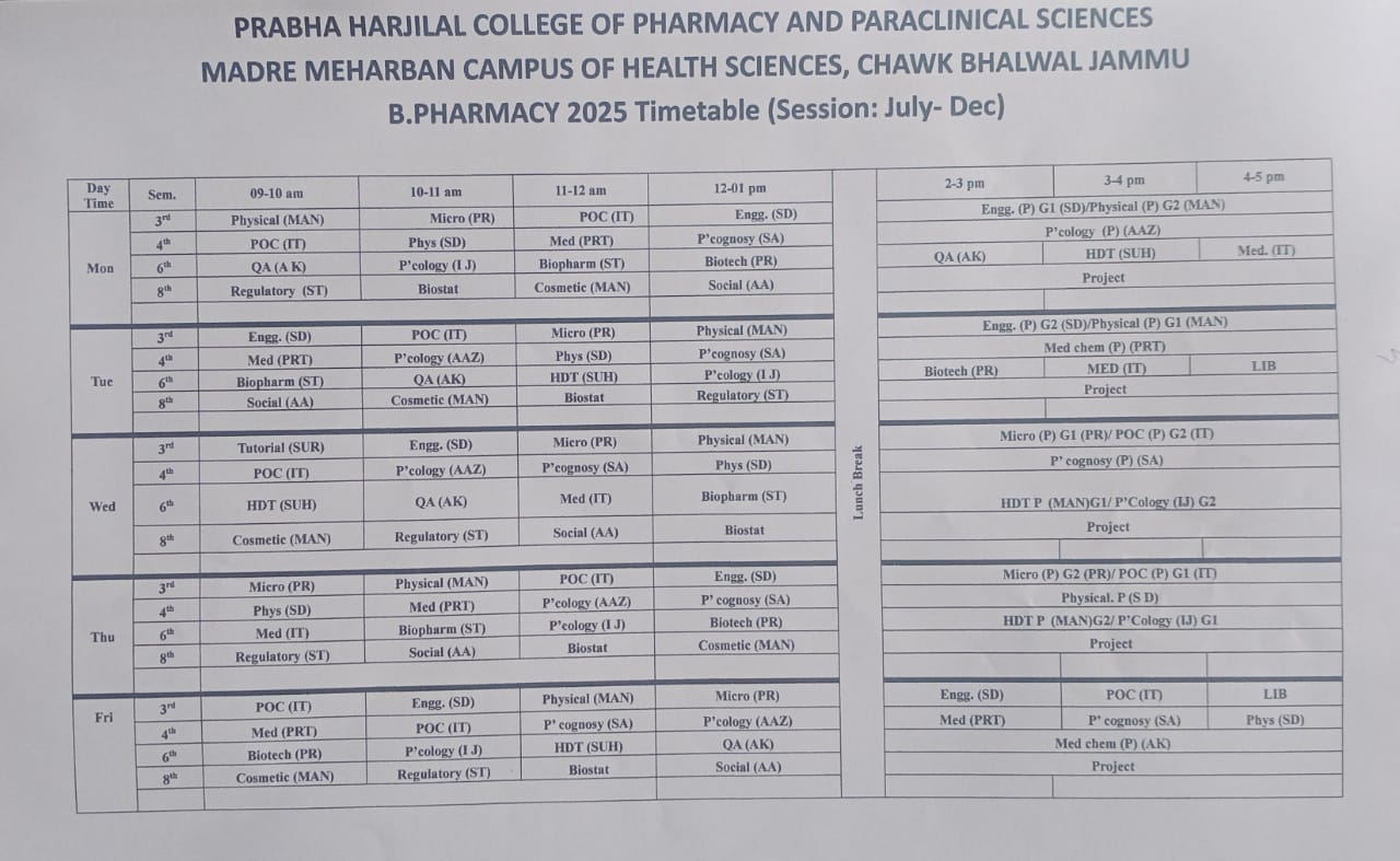 Prabha Harjilal College of Pharmacy & Paraclinical Sciences is a self financing educational institution that has been set up in the State of Jammu & Kashmir at the Madr-e-Meharban Campus of Health Sciences at Chak Bhalwal, on Jammu-Akhnoor Road at Jammu. The institution happens to be the first College of pharmaceutical sciences in the State. With the establishment of center for pharmaceutical sciences education in the State, a long felt deficiency in higher education in the region has been addressed to.